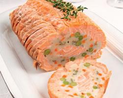 В качестве легкой закуски предлагаем вам попробовать запеченного целиком лосося с томатами, сыром и ветчиной. Для его приготовления вам понадобится следующий набор ингредиентов: 180 г сыра, перец, 80 г ветчины, 3 чесночных зубчика, соль, веточки укропа и кинзы, лимонный сок, 1 ч.л. сухого желатина, средний помидор, небольшой лосось.